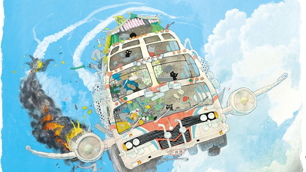 Voor in het boek legt de maker op een ontroerende manier uit waarom hij het boek opdraagt aan zijn zoon. Toen Jakob Martin Strid aan dit project begon, was zijn vrouw zwanger, nu het boek klaar is, is de jongen 15 jaar. Strid is in Denemarken een bekende politieke tekenaar die ook al aardig wat kinderboeken op zijn naam heeft staan, waarvan er nog geen één werd vertaald in het Nederlands. Het is bijzonder dat de relatief nieuwe uitgeverij Blauwe Gras het aandurfde dit monumentale boek van stoeptegelformaat uit te geven. De omvang van De fantastische bus is het eerste dat in het oog springt. Meer dan 200 dicht betekende pagina’s in een langwerpig formaat waarin je maar blijft bladeren. Er lijkt geen eind aan te komen, en dat is helemaal niet erg.